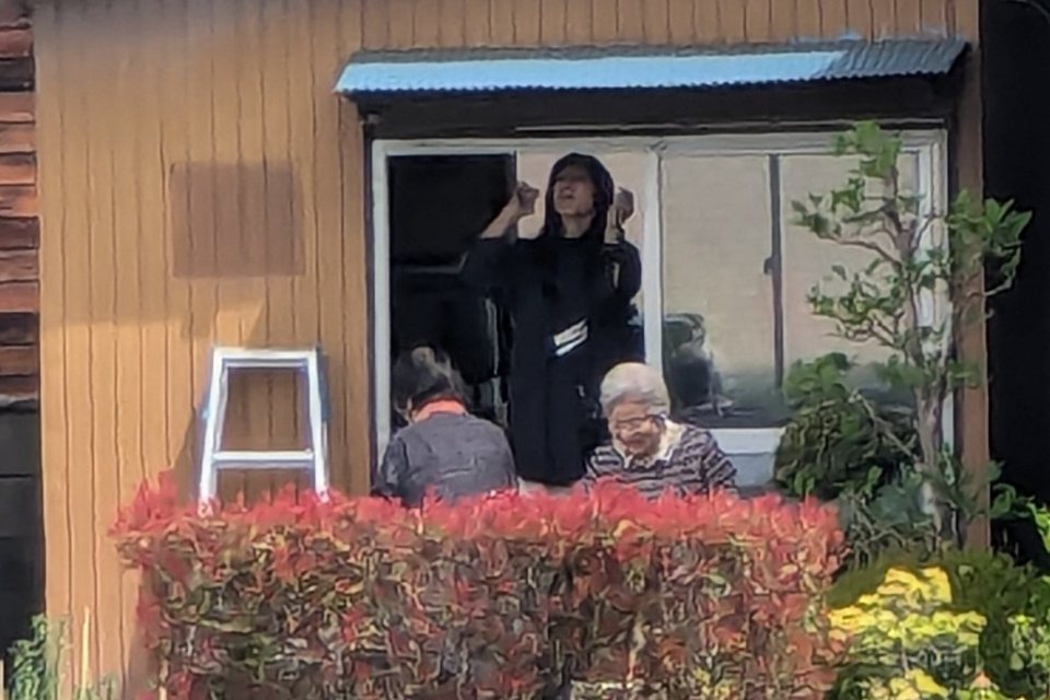 ヨン八幡町家宅は、白髪の婆さんを見て、夕は爺さんが外から雨戸閉めて中に入っていった。わたしは隣畠でイチゴの手入れをしていたから。